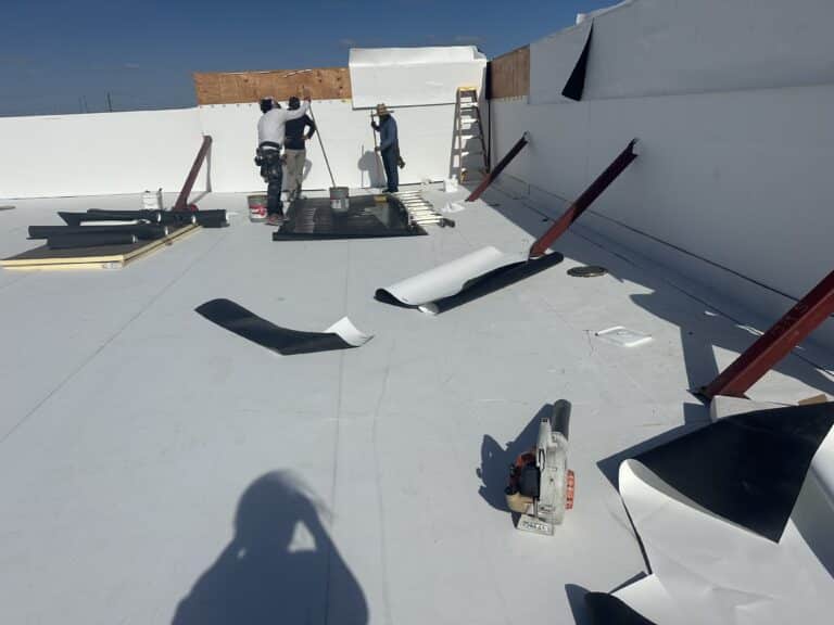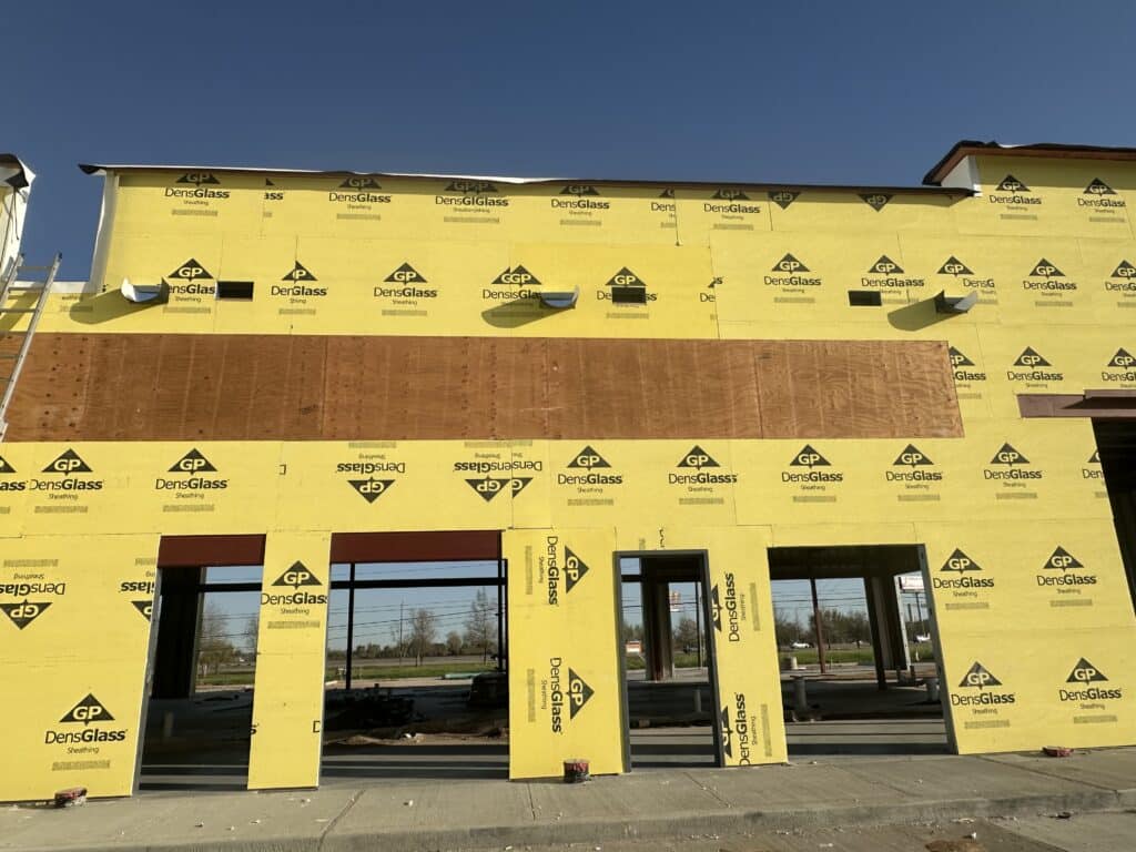 Membrane flashing is being meticulously installed around all scuppers to ensure proper water drainage, while a high-performance protective roof membrane is being laid along the parapet walls to further safeguard the structure. In parallel, trench excavation activities are actively underway in preparation for the upcoming water line connection, ensuring seamless integration of essential utility services.